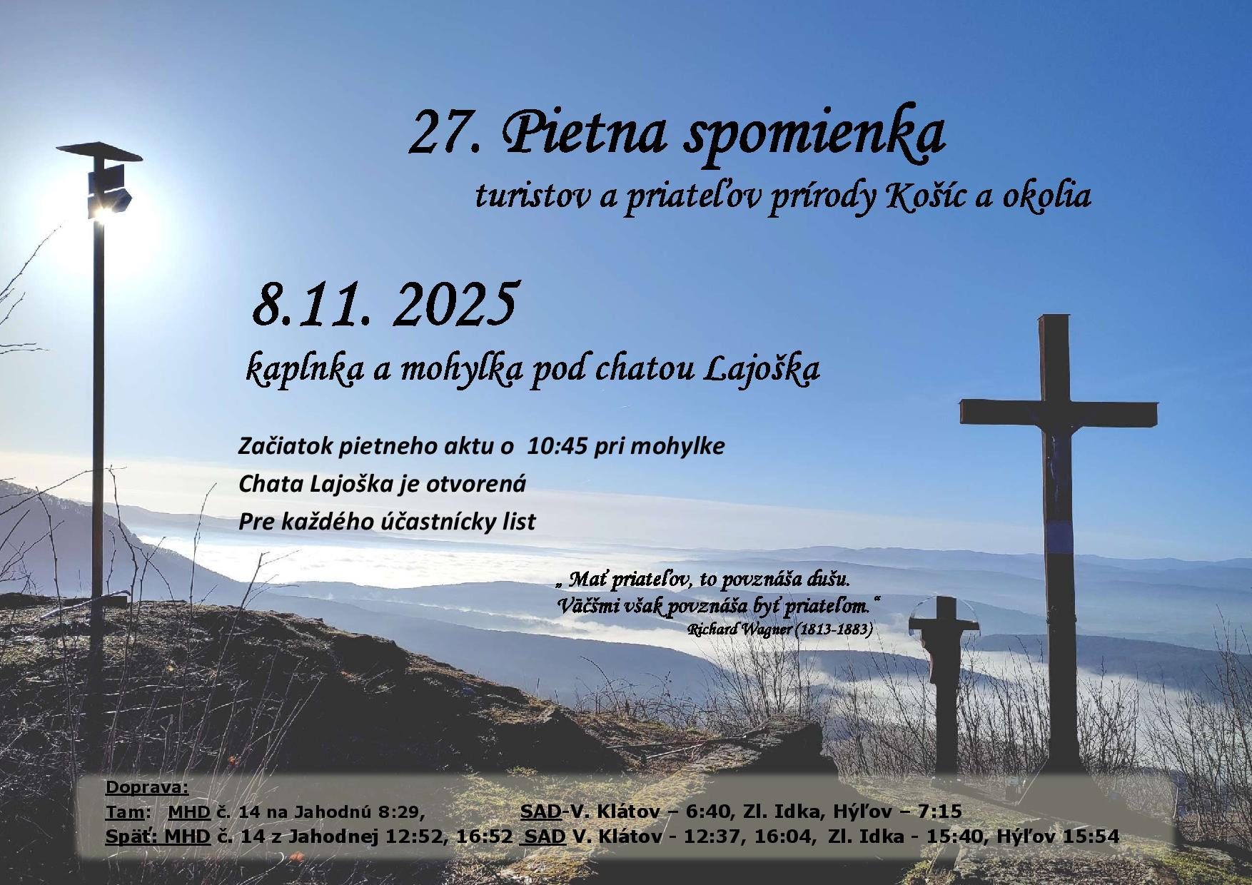 Doprava: zraz na ŽS KE o 6:50 h, odchod os. vlaku o 7:06 h do Nižnej Myšle (7:21 h). Kladenie vencov pri pamätníku od 7:00 do 8:30 h. O 8:30 h nás autobus zavezie za 1 euro do Slanca.